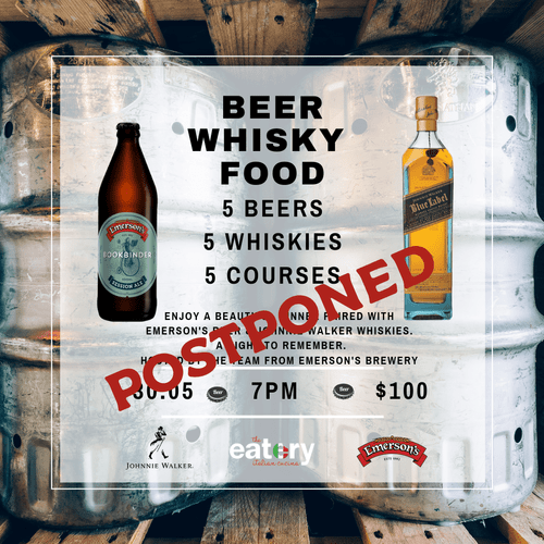 Join us in tasting 5 Emerson's beers paired with 5 Johnnie Walker whiskies paired with 5 delicious courses. Phew! What a night to remember. Hosted by Andy & Mel from The Eatery alongside the team from Emerson's Brewery. - 5 beers - 5 whiskies including the legendary Blue Label - 5 courses - Taste, appreciate, drink, eat, repeat This event is expected to sell out. Only $100 a ticket, this is a night you do not want to miss.